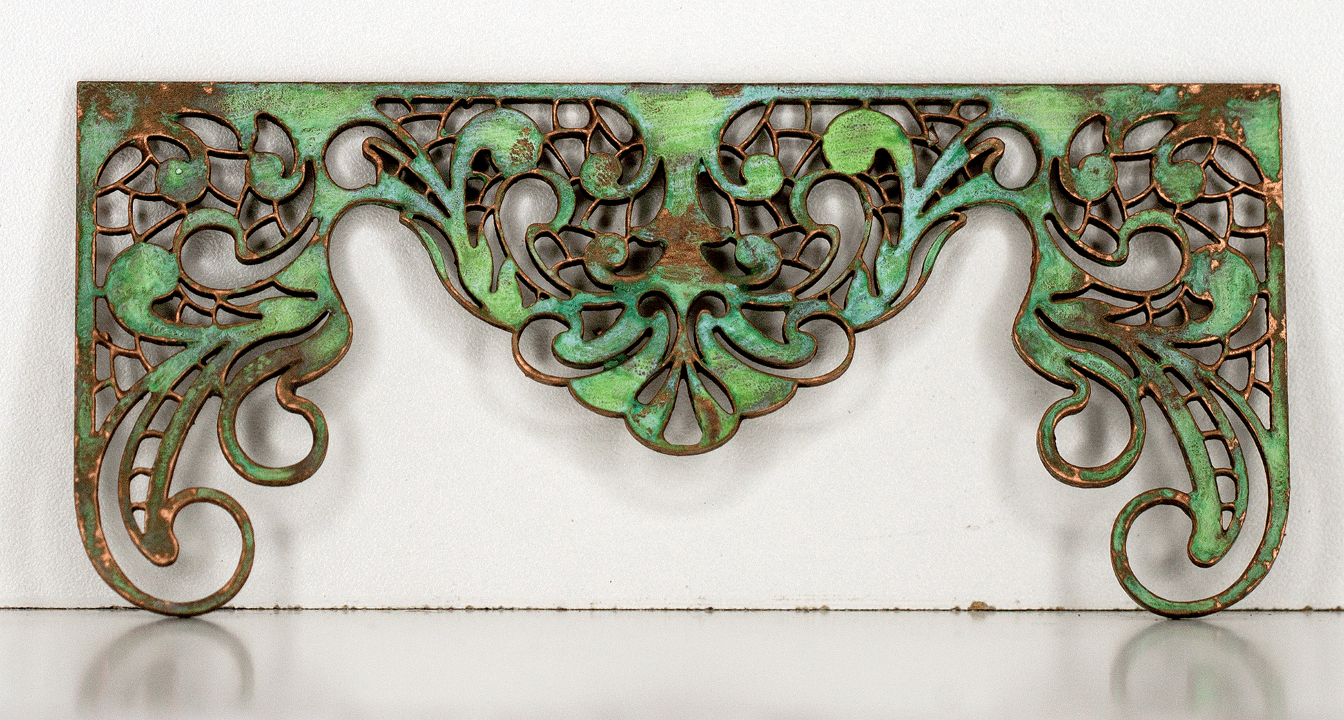 Photo Gallery shows an antiqued copper piece, a 'cognac' stained piece, and an unfinished piece.