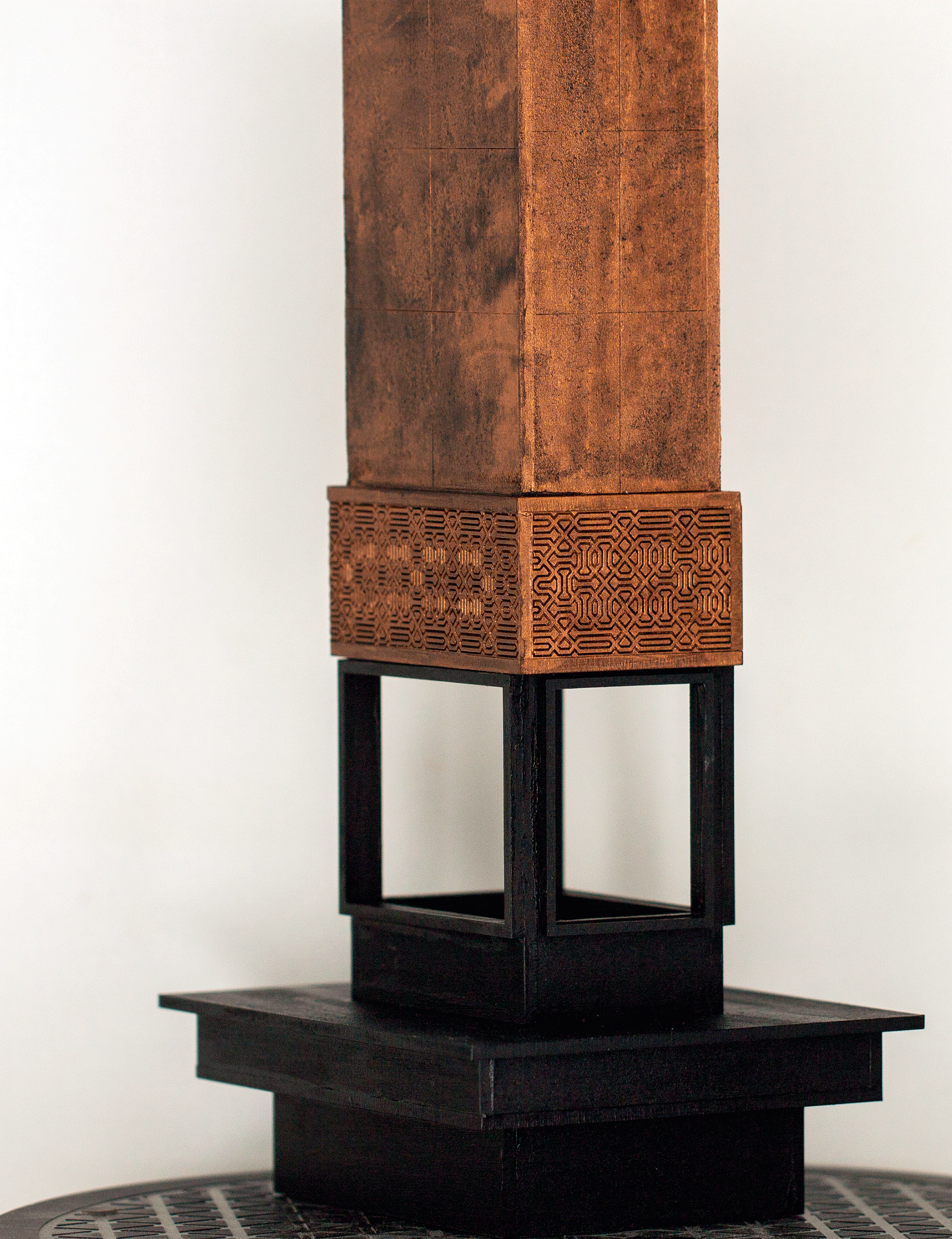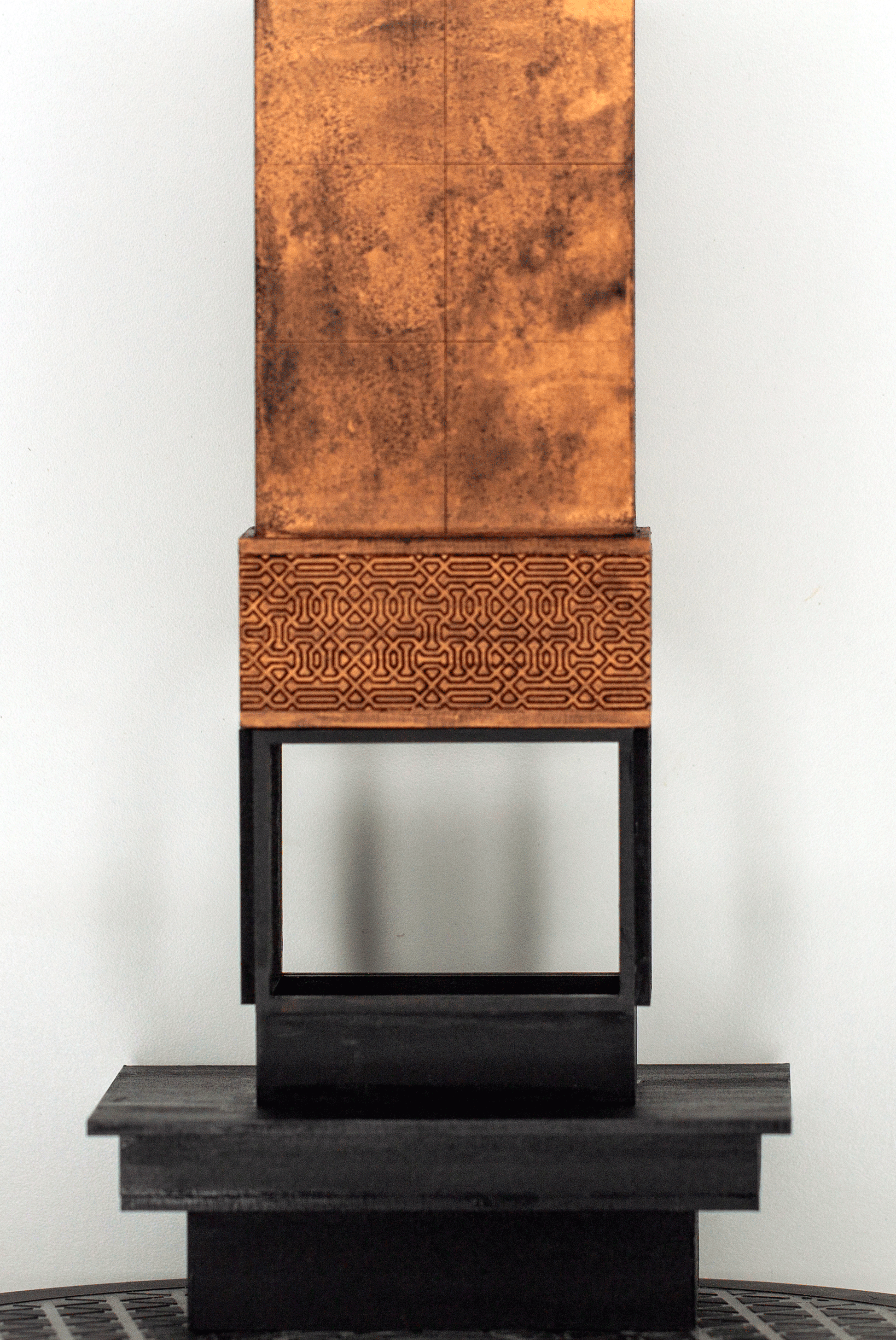The finished fireplace was painted matte black on the base and the top was done with a primer, then a metallic copper and finished with a black glaze stipple.