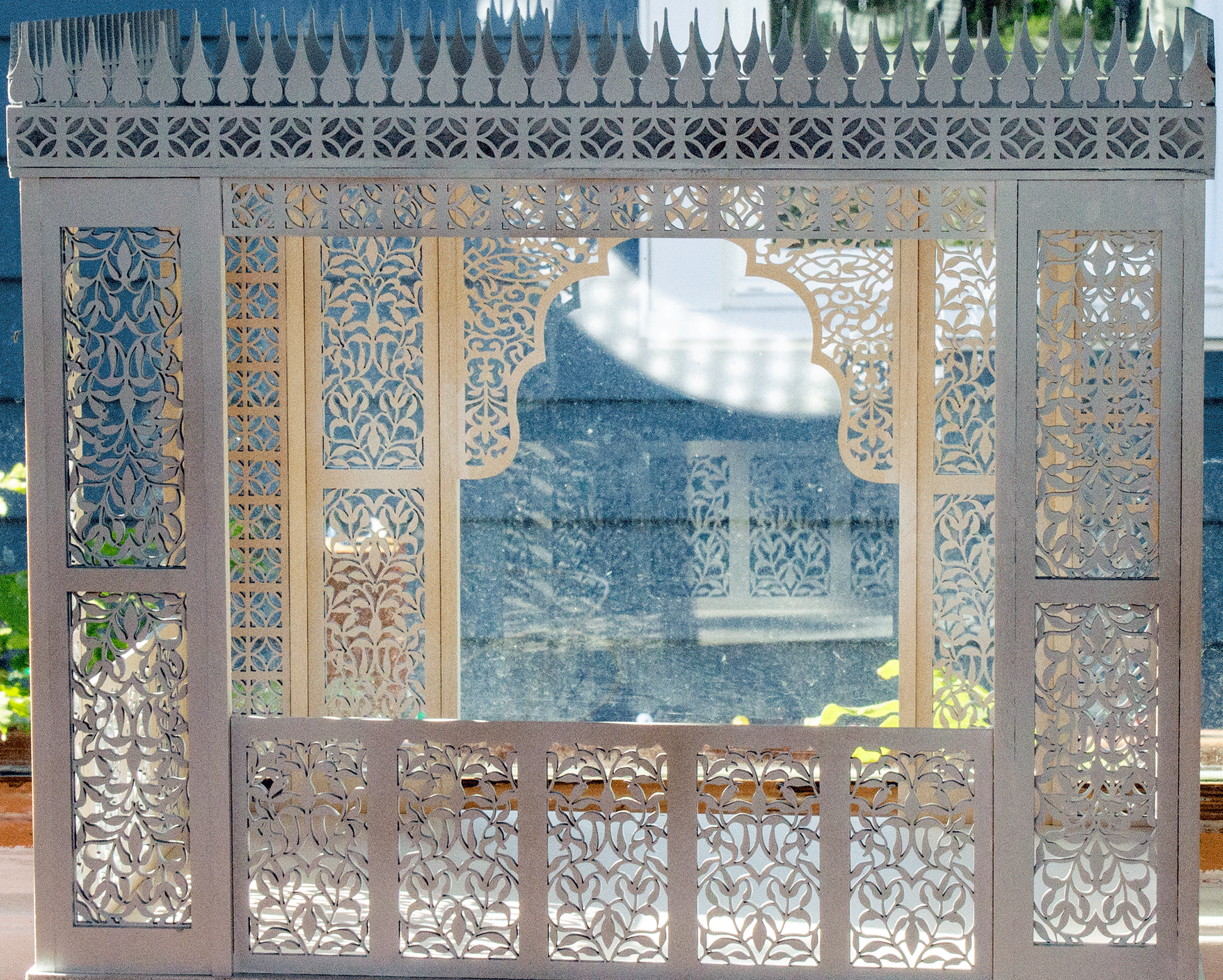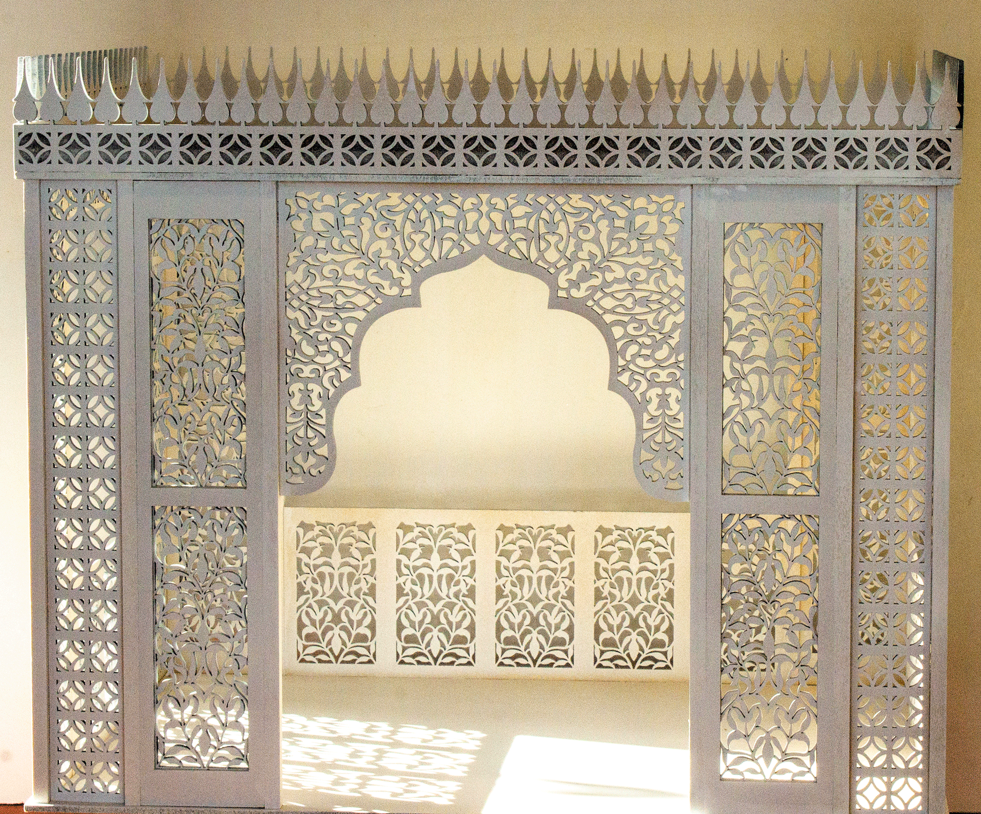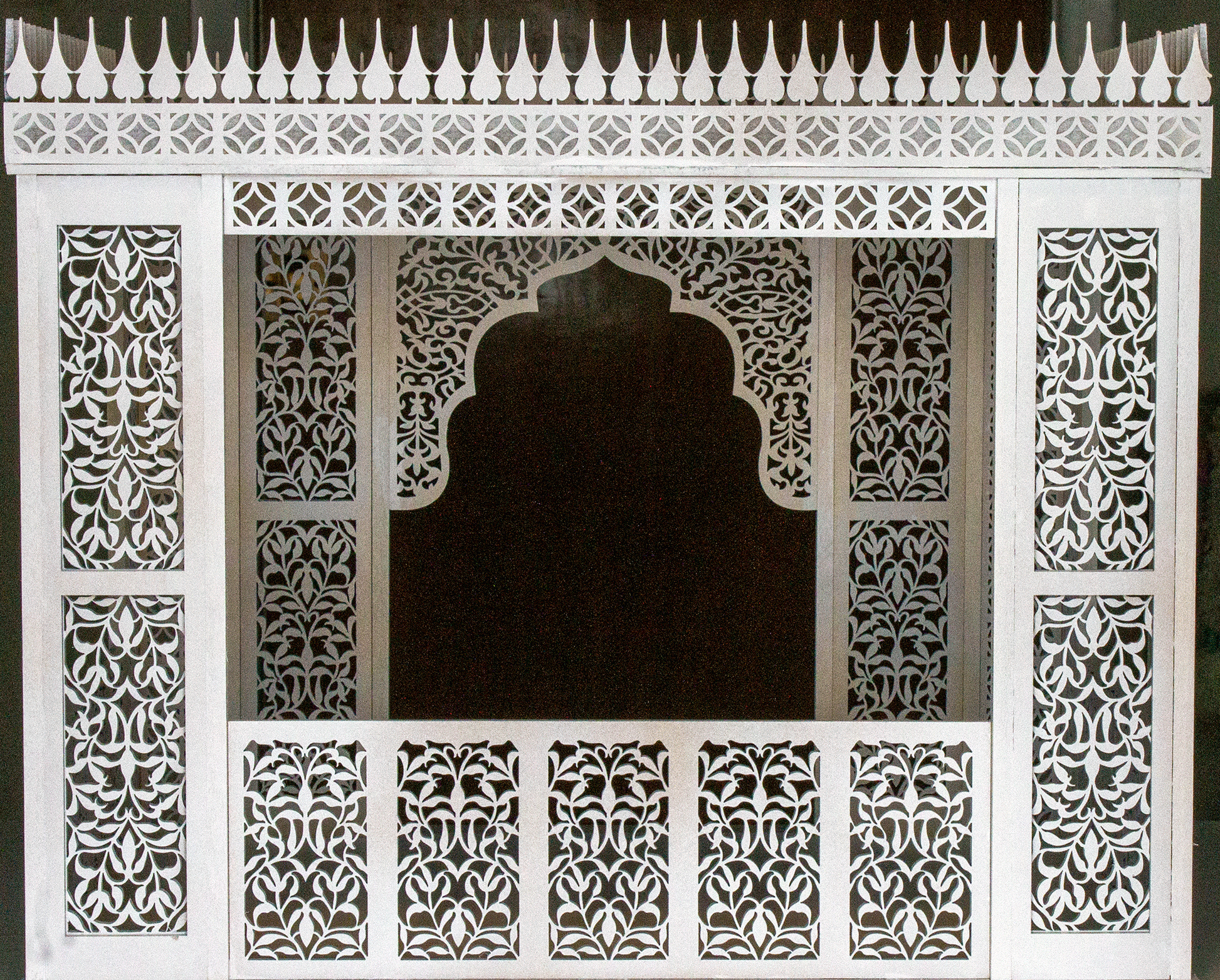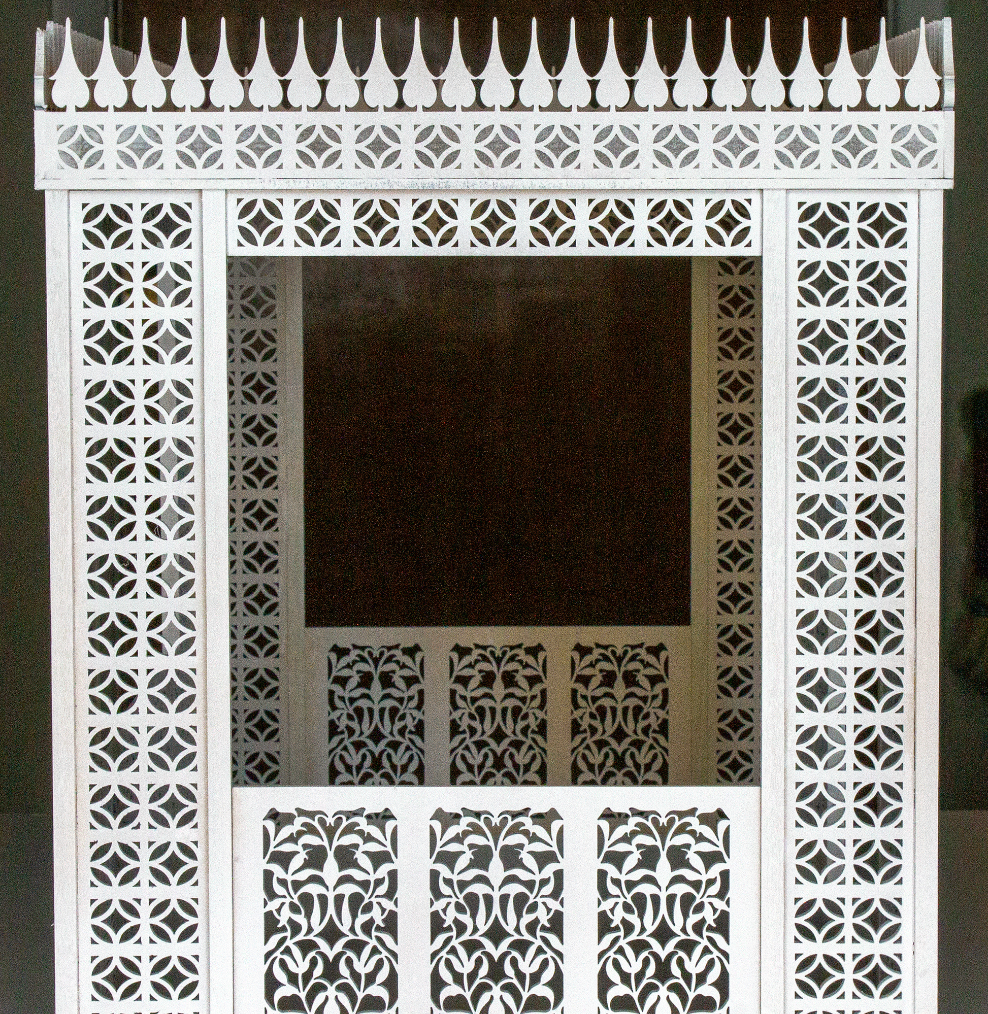 The gallery shows a sample of the finished house painted white. The first images are captured inside and the light filled images show the beauty of the filigree with the sun shining through.